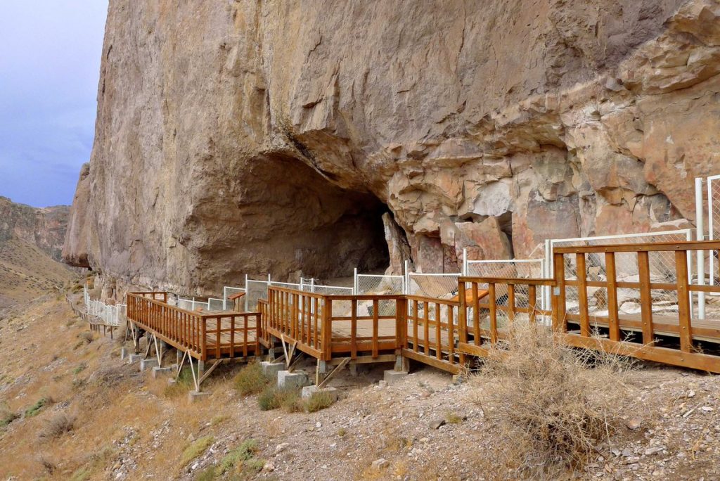 Cueva de las ManosLas cuevas conservan pinturas de los indios tehuelches y de sus antecesores, de hasta 9 mil años de antigüedad. Foto gentileza de A. Patrian. Su ubicación, solitaria, en medio del noroeste de la estepa santacruceña, le permite conservarse casi intacta. El pueblo más cercano, Perito Moreno, está a 163 kilómetros de allí. Y mas allá, ya cerca de la cordilera, se encuentra Los Antiguos, que era el lugar de descanso de los ancianos de las desaparecidas tribus indígenas.
