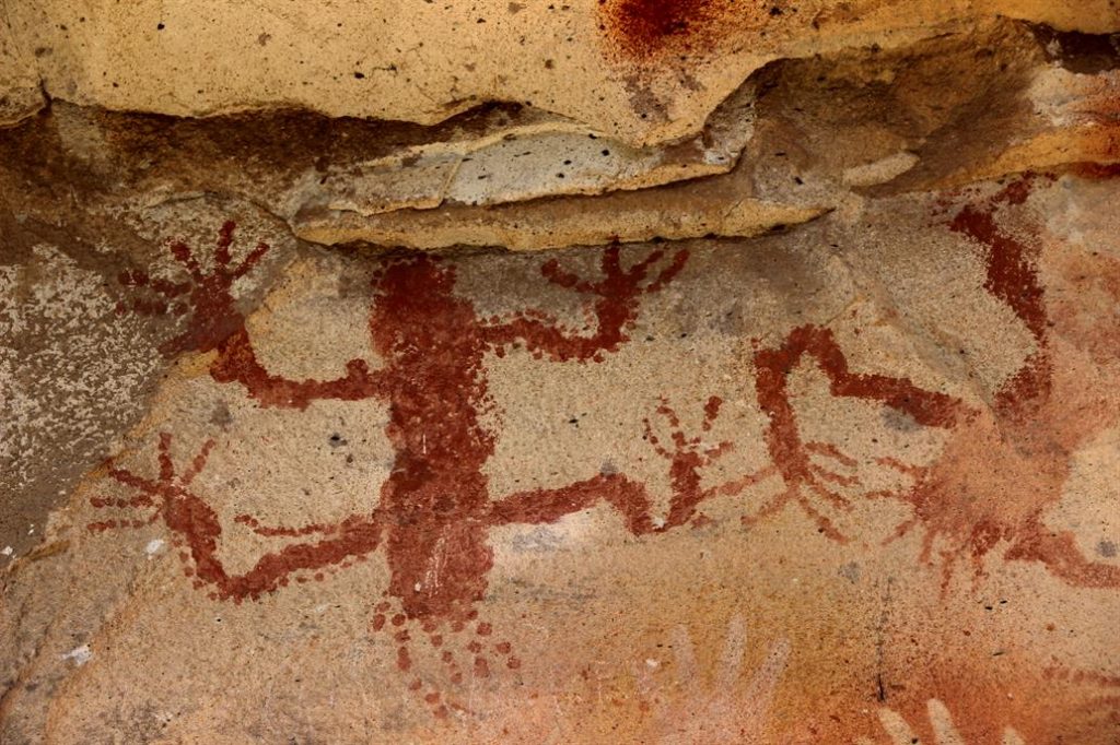 Todo tipo de imágenes puede ser encontrada en las paredes de las cuevas. Foto gentileza de A. Patrian. Las cuevas del río Pinturas guardan obras realizadas por los indios tehuelches y sus antecesores. Su antigüedad es de 9.300 años, según investigaciones realizadas. Se observan, además de manos pintadas en negativo, imágenes de guanacos, dibujos geométricos, agrupamientos de líneas, puntos y la figura solar. La mayor congregación se encuentra en la cueva propiamente dicha, Cueva de Las Manos, que tiene 24 metros de profundidad, 15 metros de ancho en la entrada y alrededor de 10 metros de altura hasta el comienzo de la visera.